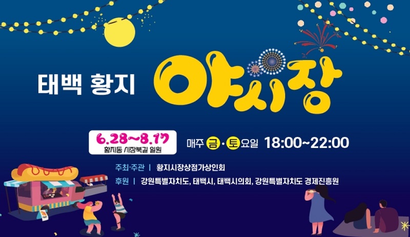 강원 태백시(시장 이상호)는 2024년 6월 28일부터 8월 17일까지, 매주 금요일과 토요일 오후 6시부터 오후 10시까지 시장북길 일원에서 '황지야시장'을 운영한다고 밝혔습니다.
