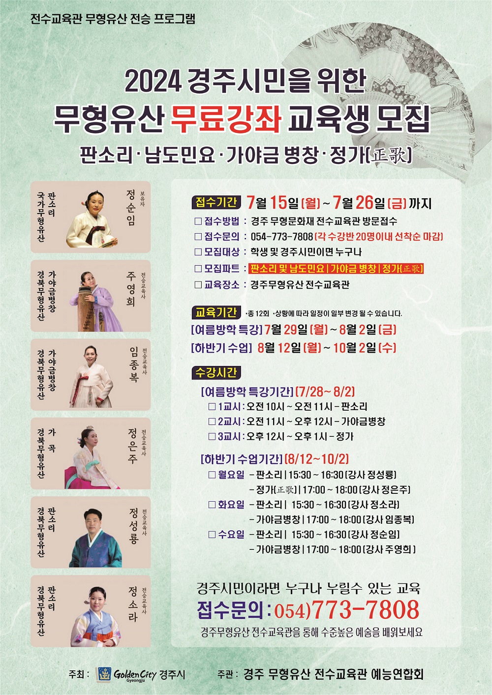 경북 경주시가 무형유산을 보다 쉽게 배우고 체험할 수 있는 '무료강좌' 교육생을 모집한다고 2024년 7월 18일 밝혔습니다.