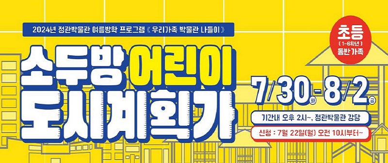 부산시립박물관 소속 정관박물관은 2024년 7월 30일부터 8월 2일까지 매일 오후 2시, 여름방학을 맞아 박물관을 찾는 어린이 동반 가족을 대상으로 '우리 가족 박물관 나들이 - 소두방 어린이 도시계획가' 교육행사(프로그램)를 운영한다고 밝혔습니다.