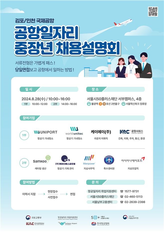 협약 이후 첫 번째 협력사업인 ‘공항일자리 중장년 채용설명회’는 8월 28일(수) 오전 10시부터 오후 4시까지 서울시50플러스 서부캠퍼스 4층에서 열립니다.