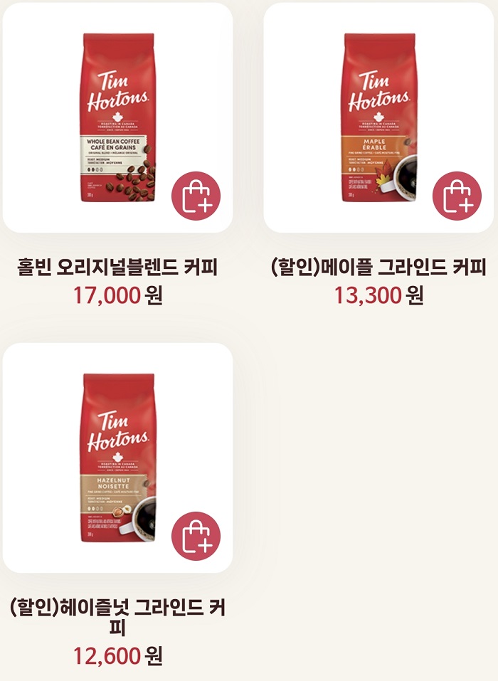 본국인 캐나다보다 높은 가격으로 커피와 다른 상품을 판매하고 있는 한국 팀홀튼(Timhortons Korea).
