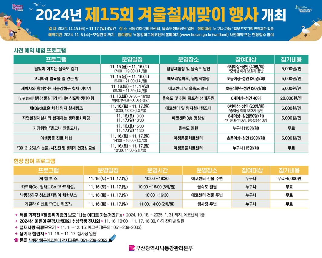 부산시 낙동강관리본부는 2024년 11월 15일부터 11월 17일까지 사흘간, 을숙도생태공원에서 제15회 겨울철새 맞이 행사'를 개최한다고 밝혔습니다.