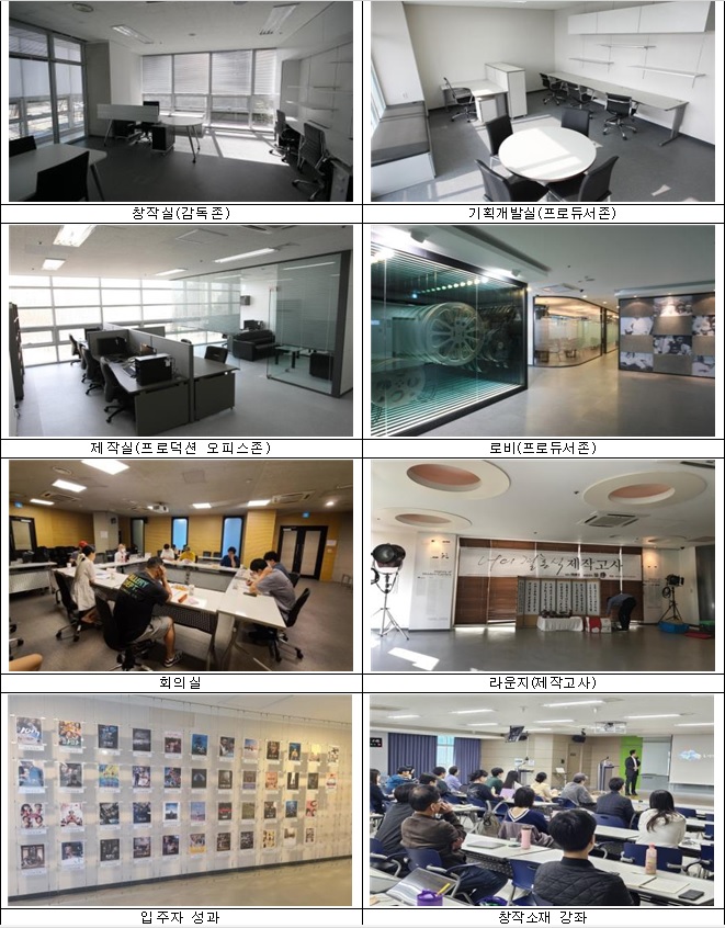 이 외에도 개인 작업실과 공용공간에서 소재 강의, 시나리오 검토(모니터링), 영화인 심리치료, 기획개발비 지원, 입주자 교류 등 실질적인 작품개발에 도움을 주는 다양한 사업을 입주자에게 모두 무료로 제공하고 있습니다.