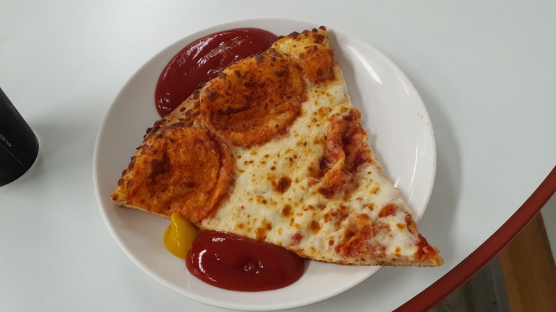 초등 입맛이라 치즈 조각피자 가장자리에 케챱을 듬뿍 뿌렸네요.