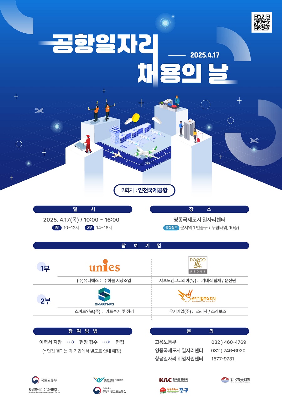 항공산업 분야 구인 기업과 구직자를 잇는 올해 2번째 ‘공항 일자리 채용의 날 행사’가 2025년 4월 17일, 영종국제도시 일자리센터(주소: 인천 중구 영종대로 94 두림타워웰스복합 10층)에서 열립니다.