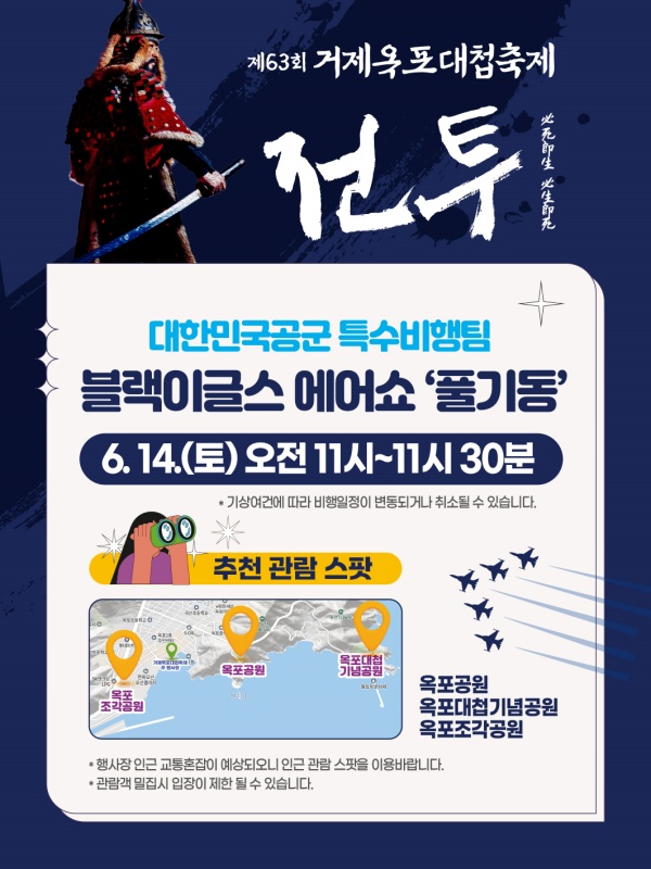 거제시 관계자는 “거제시민 및 인근 지역 시민들에게 비행소음 양해를 부탁드리며, 옥포수변공원 외에도 추천 관람 장소(스팟; 옥포(중앙)공원, 옥포대첩기념공원, 옥포조각공원)에서 블랙이글스 에어쇼를 마음껏 감상할 수 있으니 많은 관람 바란다”고 말하였습니다.