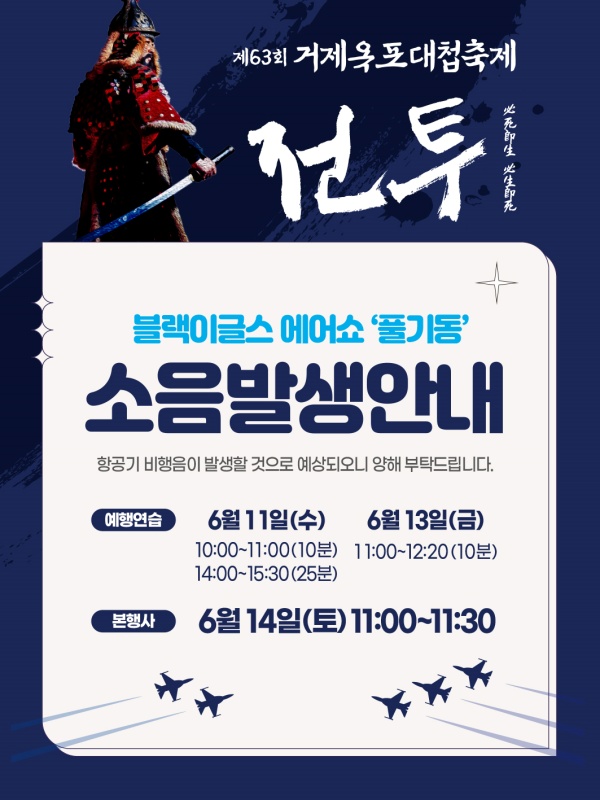 '제63회 거제옥포대첩축제' 개최를 축하하기 위하여 대한민국 공군 특수비행팀 '블랙이글스'가 옥포수변공원 상공에서 축하비행을 진행합니다.