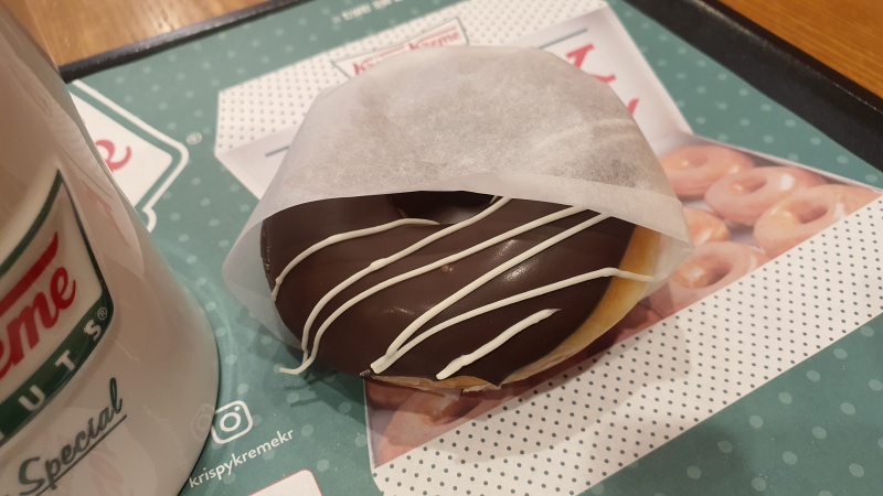 한국 크리스피크림 도넛(KrispyKreme Doughnuts)에서 판매하는 간판 도넛(도너츠) 중 하나인 '초콜릿 아이스드 글레이즈드'.