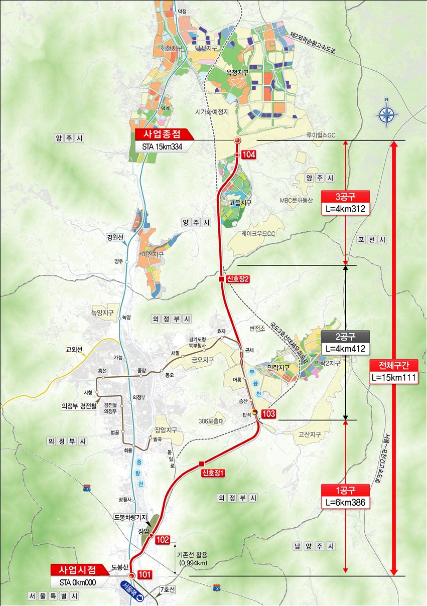 1공구는 서울시 도봉동과 의정부시를, 3공구는 의정부시 자금동과 양주시 고읍동을 잇는 구간입니다.