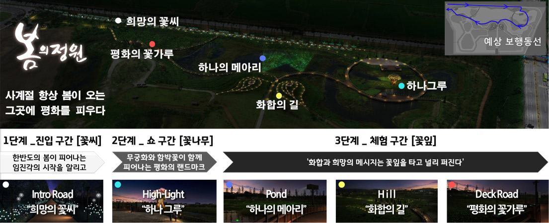 북에서 날아온 꽃씨가 무궁화와 함박꽃을 피워내고 꽃잎을 흩날리며 평화의 메시지를 퍼뜨린다는 스토리텔링과, 구역별로 이야기에 맞는 연출을 통해 관광객의 흥미를 유도합니다.