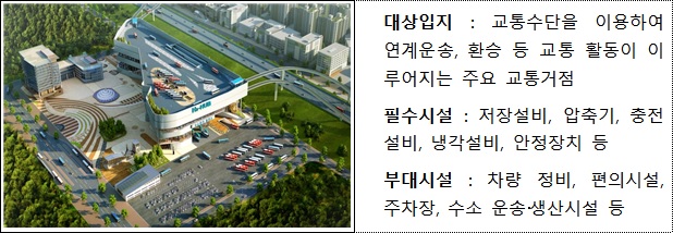 ‘수소교통 복합기지’는 교통수요가 많은 교통거점에 대용량 수소 충전소와 함께 관련 부대시설을 설치할 수 있도록 하여 활용성, 확장가능성을 고려한 수소충전소의 새로운 사업 모델입니다.