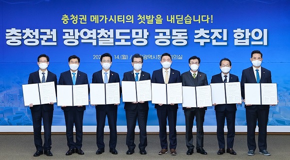 대전시와 세종시, 충북도, 충남도는 2020년 12월 14일 오전, 대전시청 대회의실에서 ‘충청권 광역철도망 구축을 위한 공동 건의문’에 서명했습니다.