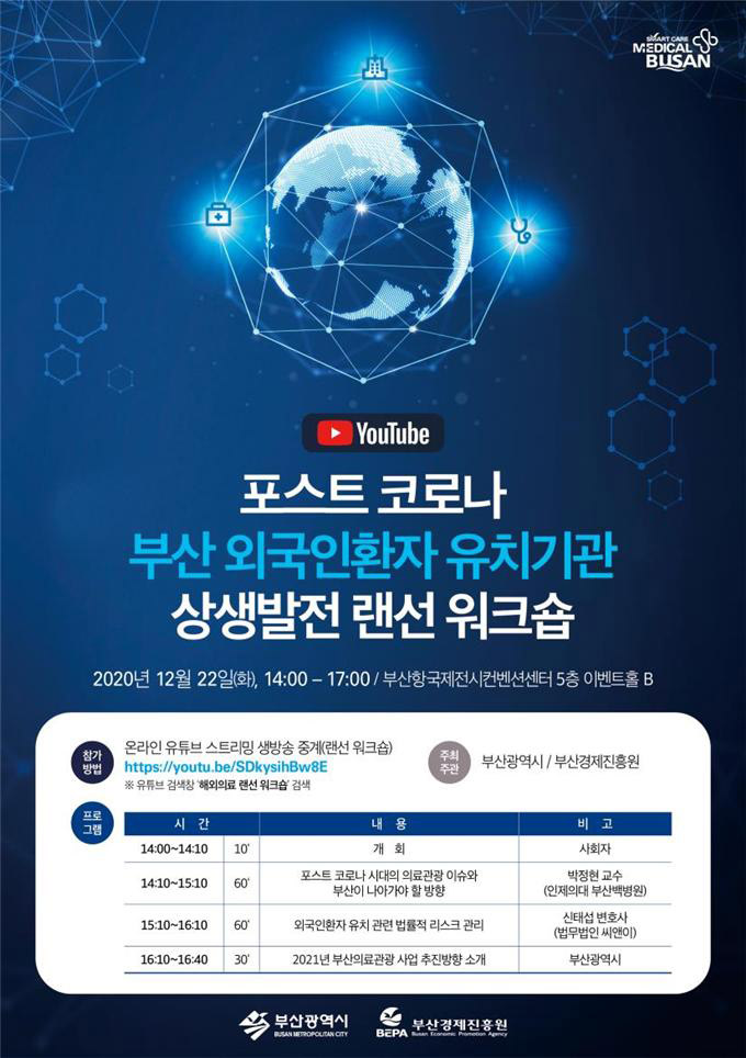 부산시(시장 권한대행 변성완)와 (재)부산경제진흥원은 2020년 12월 22일 오후 2시 부산항국제전시컨벤션센터에서 포스트 코로나19(코로나바이러스 대유행 이후 시대)에 대비해 부산의료관광 역량강화 온라인 워크숍을 개최한다고 밝혔습니다.