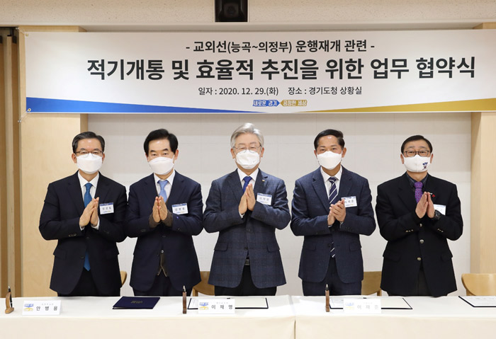 이재명 경기도지사는 2020년 12월 29일 오전, 경기도청 상황실에서 이재준 고양시장, 안병용 의정부시장, 조학수 양주부시장과 이 같은 내용의 ‘교외선 운행재개 적기개통 및 효율적 추진을 위한 업무협약’을 체결했습니다.
