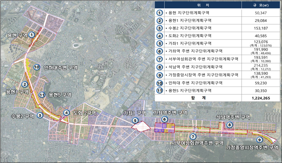 지구단위계획은 인천대로 10.45킬로미터(km) 구간을 따라 미추홀구 6개 구역(용현, 용현1, 수봉2, 도화2, 인하대 주변, 용현5)과 서구 5개 구역(가좌1, 가좌역 주변, 서부여성회관역 주변, 석남역 주변, 가정중앙시장역 주변) 등 11개 구역 122만평방미터(㎡)에 대해 수립했습니다.