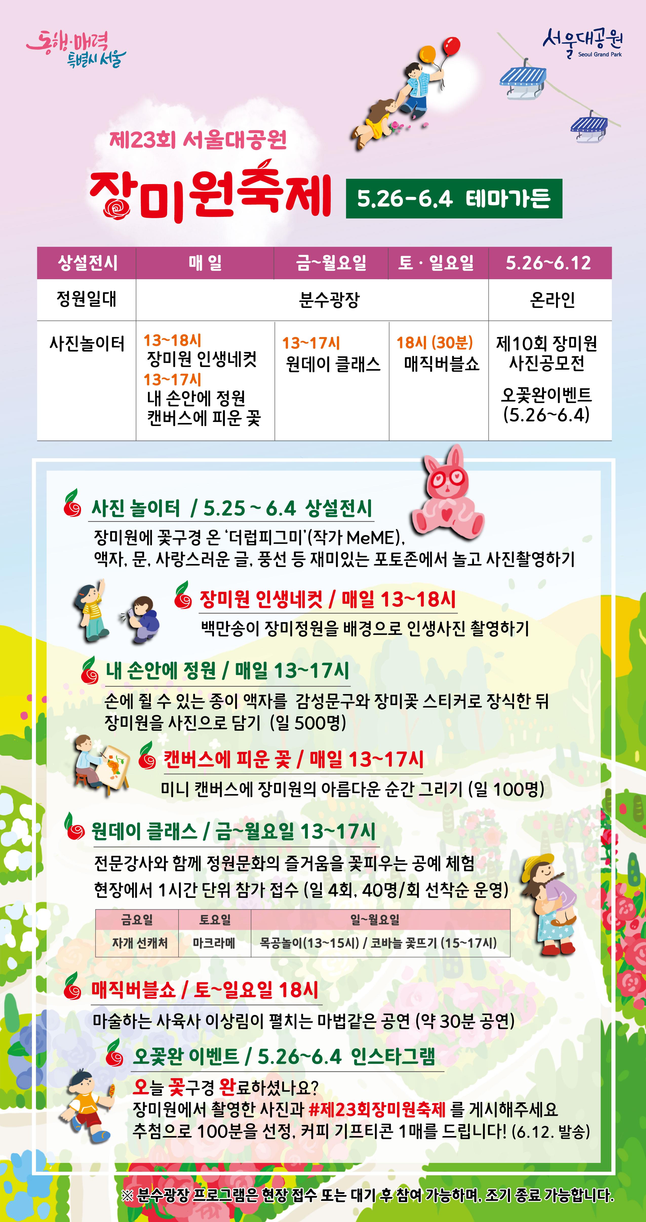 팝아티스트 작가 MeME의 ‘더럽피그미(The Love Pig Me)’ 작품, 액자와 문 등 다양한 포토존에서 사진 찍으며 놀 수 있는 ‘사진 놀이터’, 드넓은 장미원을 배경으로 촬영하는 ‘장미원 인생네컷’, 종이액자를 나만의 감성문구와 스티커로 꾸며 정원을 담아내는 ‘내 손안에 정원’, 미니 캔버스에 장미를 그리는 ‘캔버스에 피운 꽃’은 매일 운영합니다.