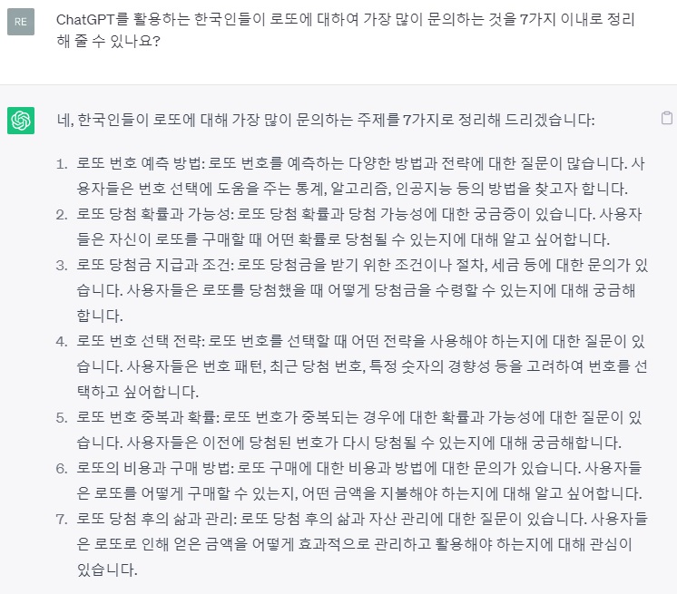 질문 : ChatGPT를 활용하는 한국인들이 로또에 대하여 가장 많이 문의하는 것을 7가지 이내로 정리해 줄 수 있나요?