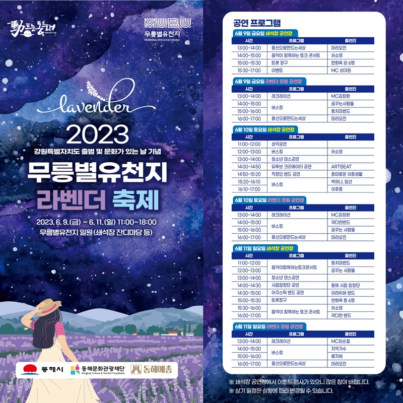 강원특별자치도 출범 및 문화가 있는 날을 기념해 전 연령층이 참여할 수 있는 ‘무릉별유천지 라벤더 축제’가 2023년 6월 9일(금), 동해 무릉별유천지에서 열립니다.