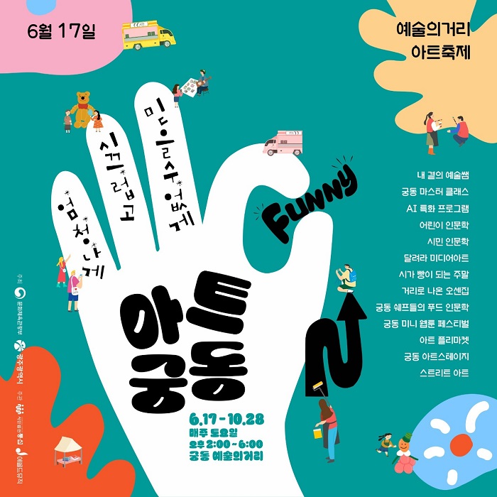 6월 17일 개막행사에는 내곁의 예술쌤과 궁동 마스터클래스, 아트플리마켓, 궁동 아트스테이지, 시가 빵이 되는 주말, 어린이 아트 활쏘기 놀이, 인공지능(AI)과 함께 그려보는 명화, 시를 쓰면 시인이 빵을 주는 ‘시가 빵이 되는 주말’ 등 다양한 문화예술 체험 프로그램을 진행합니다.