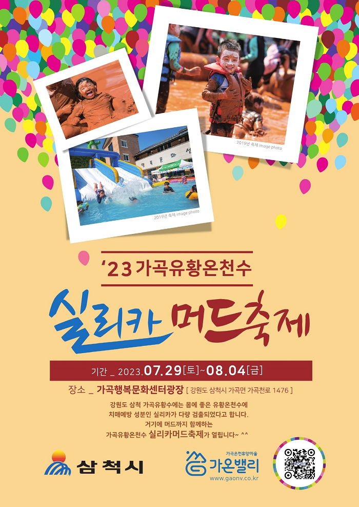 강원 삼척시는 2023년 4월 개장한 가곡 유황온천 및 국민여가캠핑장을 적극 홍보하여 관광객 방문을 촉진하고자 '2023년 가곡 유황온천수 실리카 머드축제'를 개최한다고 밝혔습니다.
