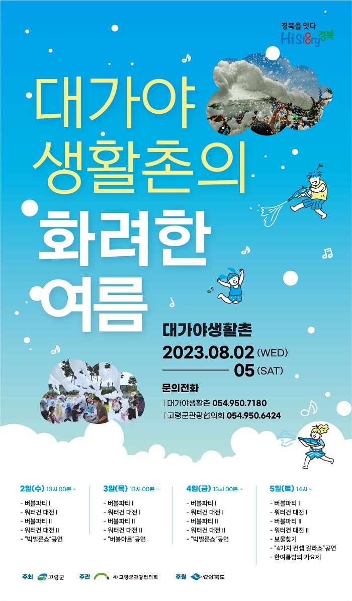 경북 고령군(군수 이남철)은 2023년 8월 2일부터 5일까지 '대가야생활촌'에서 여름 휴가철을 맞은 관내주민과 관광객들을 위한 '대가야 생활촌의 화려한 여름'을 운영합니다.