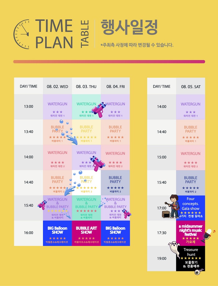 특히 8월 5일 토요일에는 야간프로그램의 일환으로 '한여름 밤의 가요제'와 무대공연 4가지 컨셉 '갈라쇼 공연'이 예정되어 방문객들의 귀를 즐겁게 해 줄 예정입니다.