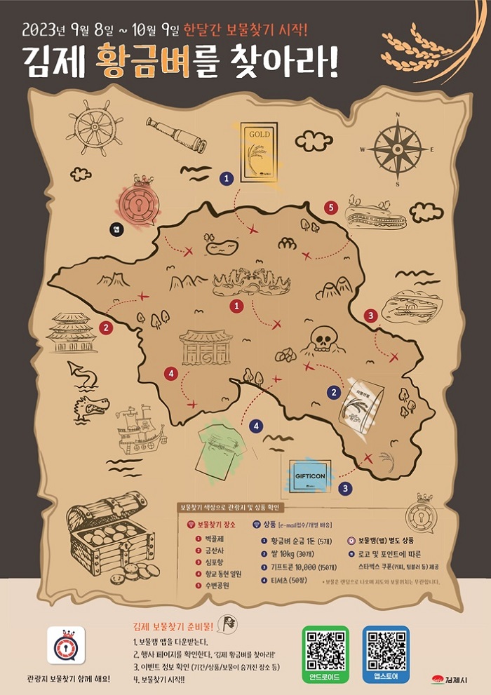 전북 김제시(시장 정성주)는 2023년 9월 8일부터 10월 10일까지, 김제 대표 관광지 방문 활성화를 위하여 보물찾기 이벤트 - '황금벼를 찾아라!!'를 진행합니다.