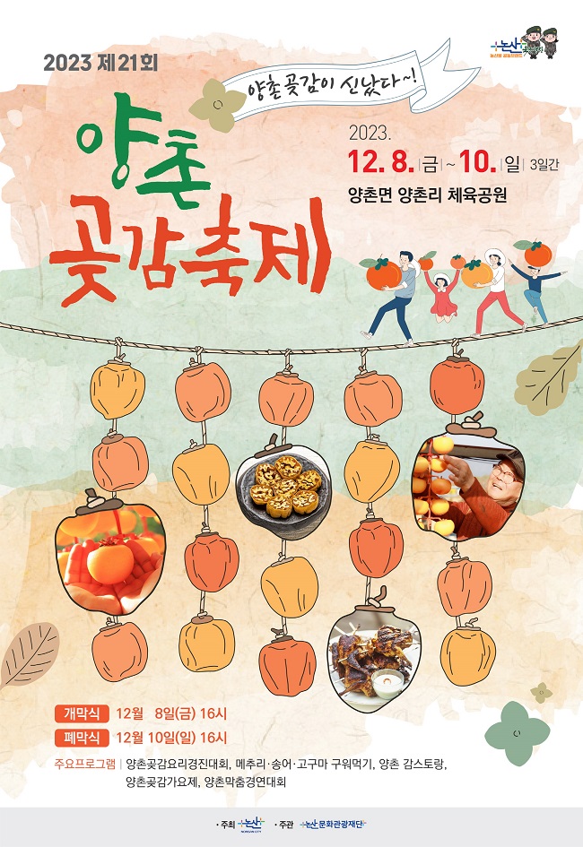 충남 논산시(시장 백성현)가 주최하고 논산문화관광재단(대표이사 지진호)이 주관하는 '2023 양촌곶감축제'가 12월 8일 개막합니다.
