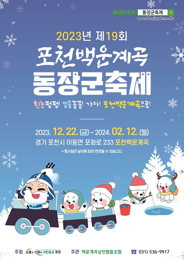 포천시(시장 백영현)와 백운계곡상인협동조합은 2023년 12월 23일, 백운계곡에서 '제19회 포천백운계곡 동장군 축제'를 개막했다고 밝혔습니다.