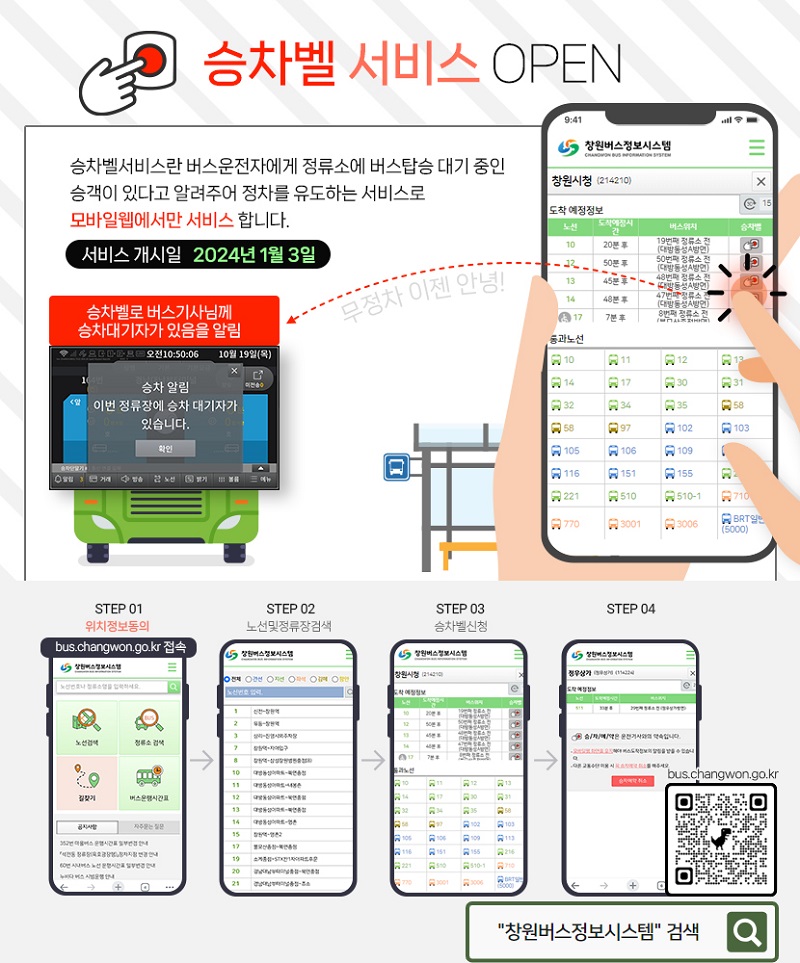 창원특례시(시장 홍남표)는 2024년 1월 3일부터 '승차 예약정보'를 버스 운전자에게 알려주는 '창원시 버스정보시스템(BIS) 승차 벨 서비스'를 시행한다고 밝혔습니다.