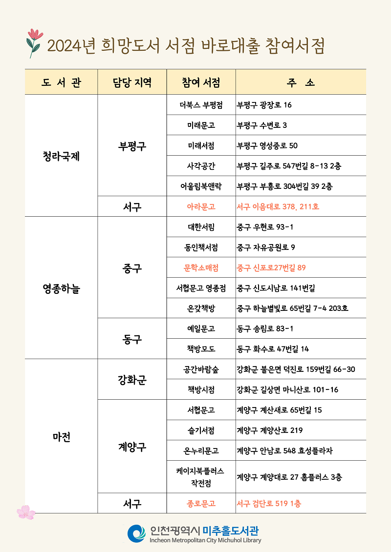 ★ 2024년 인천 '희망도서 서점 바로대출 사업' 참여 서점 명단(위치.주소)