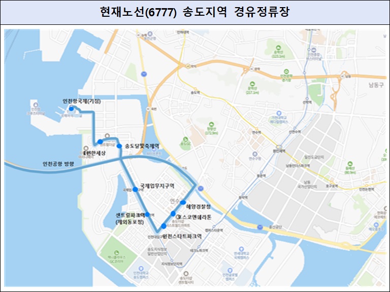 또한 공항버스 6777번 노선은 송도지역 미송초등학교, 송도이안, 더프라우 등 상행 2개, 하행 2개 정류소를 추가로 정차합니다.