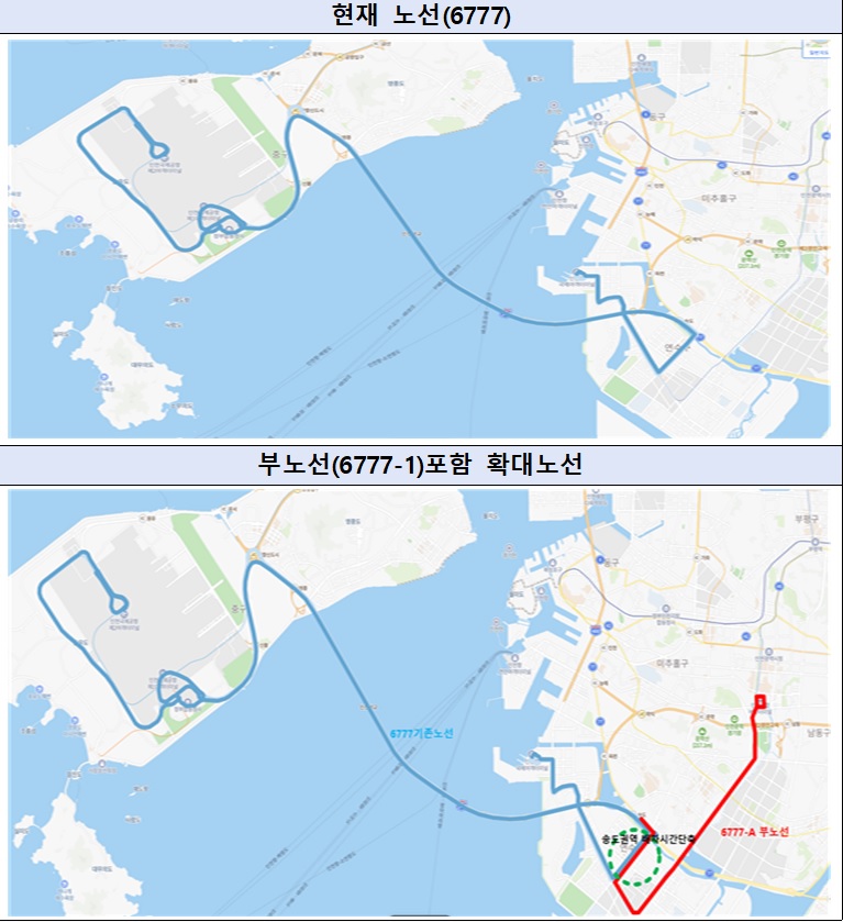 이에 따라 인천시는 6777번 노선의 이용 추이, 이용객 민원을 수렴하고 운수업체와 협의하여 보다 많은 시민들이 이용할 수 있도록 운행노선을 확대하였습니다.