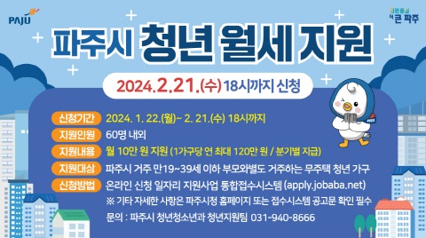 경기 파주시는 지속되는 물가 상승으로 주거비 부담이 더 커진 청년들의 주거비 부담을 완화하기 위하여 2024년 1월 22일부터 2월 21일까지 청년 월세 지원 사업 상반기 참여자 60명을 모집한다고 밝혔습니다.