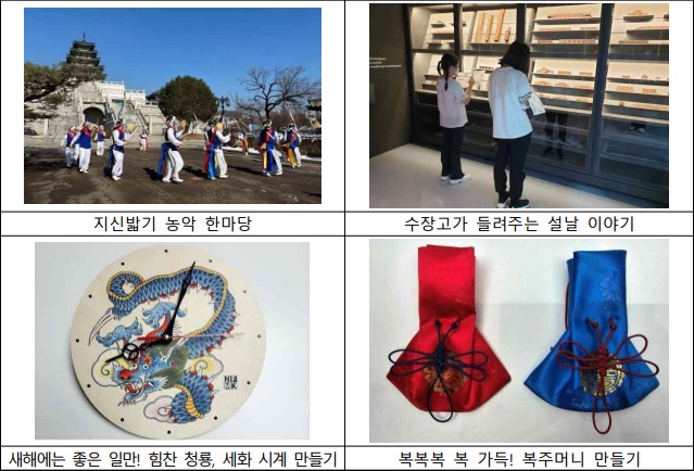 설날과 관련한 다양한 소장자료를 관람하며 궁금증을 해결하는 '수장고가 들려주는 설날 이야기' 체험활동을 즐길 수 있고, 소장품에 숨어있는 ‘용(龍)’ 자를 찾아 SNS에 인증하는 '갑진년, 용(龍)을 찾아라!' 행사(이벤트)에 참여할 수 있습니다.