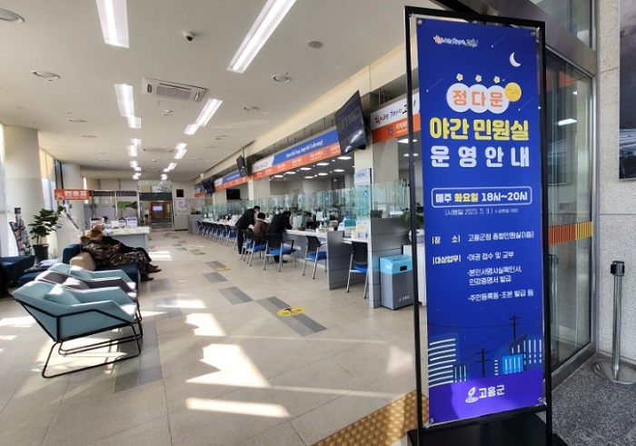고흥군(군수 공영민)은 평일 근무시간 내에 민원실 방문이 어려운 직장인, 학생, 주민 등의 불편을 해소하기 위하여 '정다운 야간 민원실'을 운영한다고 2024년 2월 7일 밝혔습니다.