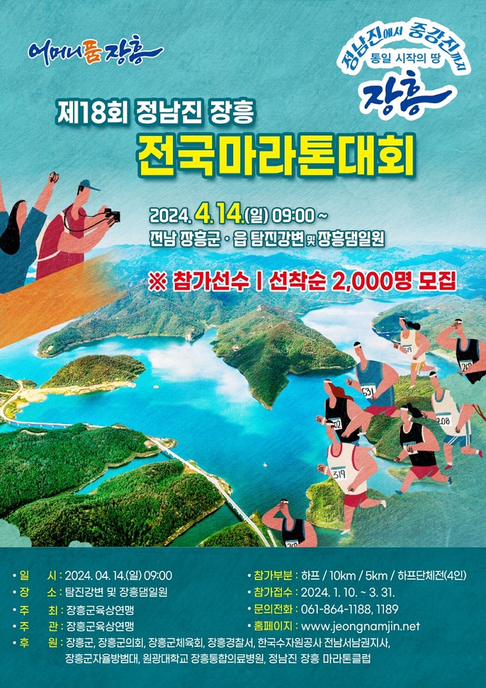 '제18회 정남진 장흥 전국 마라톤 대회'가 2024년 4월 14일, 장흥군 탐진강변에서 열립니다.