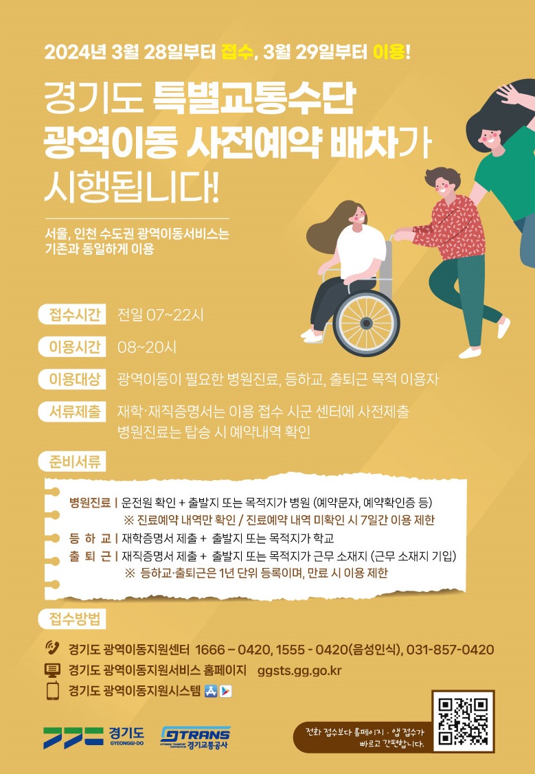 경기도가 2024년 3월 28일부터 병원 진료, 출근.퇴근, 등교.하교 등 3개 활동에 한하여 시.군 간 교통약자 이동 특별 교통수단(일명 장애인콜택시) 사전 예약제를 시행합니다.