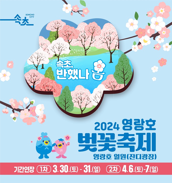 강원 속초시는 3월 30일부터 31일까지 개최하는 '2024 영랑호 벚꽃축제'를 앞두고, 벚꽃 개화가 늦어짐에 따라, 축제를 연장 진행하기로 결정하였습니다.