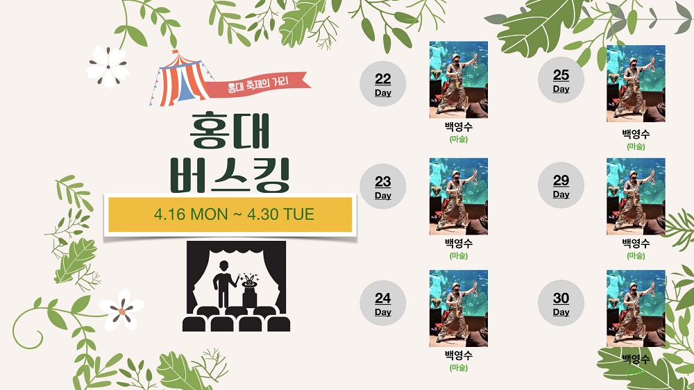 서울 마포구에서는 홍대 레드로드 R4 구역(축제거리)에서 열리는 버스킹 행사 일정을 아래와 같이 공지했습니다.