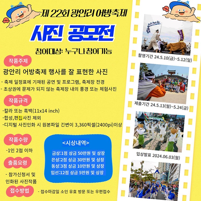 부산 수영구에서는 '광안리 어방축제'를 전국에 알리고, 지역관광 및 사진예술 활성화를 위하여 2024 제22회 광안리어방축제 개최 기념 사진 공모전을 아래와 같이 진행합니다.