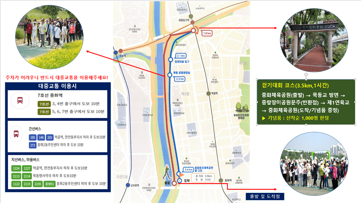 중화체육공원 출발 → 묵동교 방면 중랑천변 → 중랑 장미공원 문주(반화점) → 제1 연육교 → 중화체육공원 도착