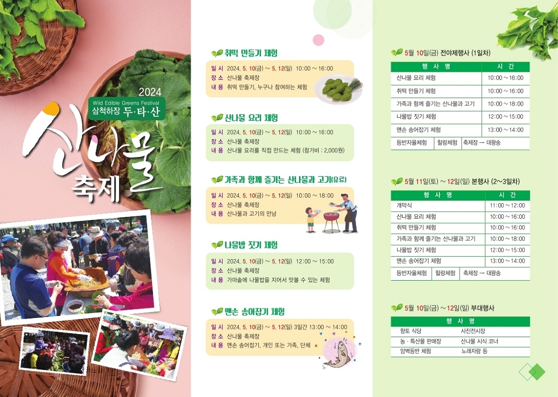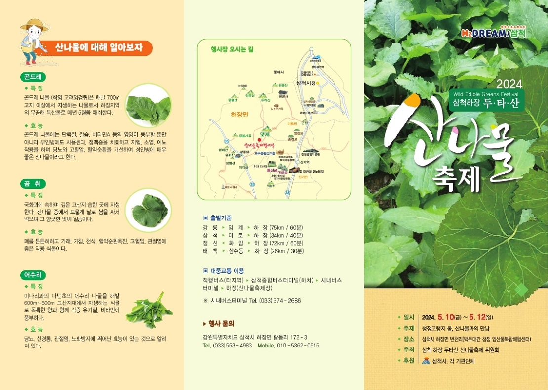 이번 축전은 삼척하장 두타산 산나물축제위원회가 주최하며, 23종의 다채로운 행사를 진행할 예정입니다.