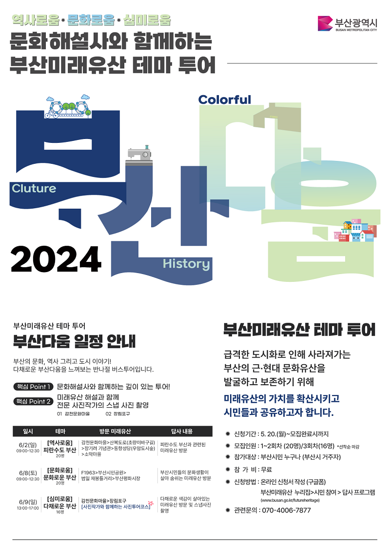 부산시(시장 박형준)는 2024년 6월 2일부터 10월까지, 총 6회에 걸쳐 '부산 미래유산 테마 투어(주제관광; 답사)'를 운영한다고 밝혔습니다.