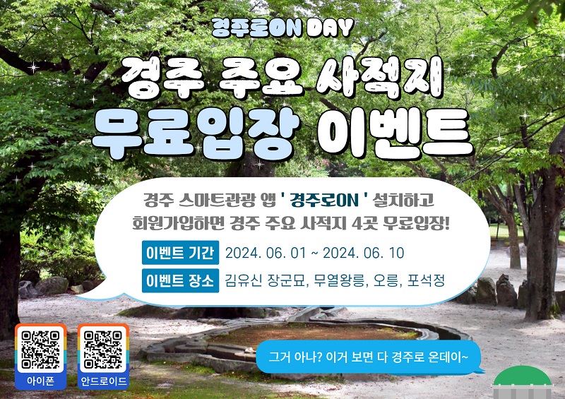 6월 4일, 시에 따르면 경주 통합관광 모바일 앱(애플리케이션)인 '경주로ON(온)' 회원가입을 확인받으면 태종무열왕릉, 김유신장군묘, 경주오릉, 포석정에 무료 방문이 가능하며, 행사 기간은 2024년 6월 10일까지입니다.